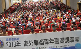 亞洲大學承辦2013年第八梯次海外華裔青年台灣觀摩團,共有300名來自馬來西亞的華裔青年,今天齊聚在亞洲大學,個個配戴八家將臉譜,進場觀賞九天民俗技藝團表演;九天民俗技藝團推出祈天戰鼓、龍王鼓等鼓技,氣勢磅礡,還表演電音三太子、財神跳加官等民俗技藝,贏得不少喝采。