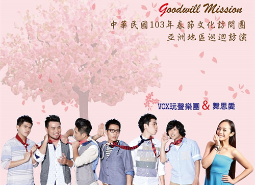 僑務委員會為慶祝中華民國103年農曆春節,特於2月上旬遴派「玩聲樂團」及「歐開合唱團」籌組春節文化訪問團,分赴亞洲及歐洲22個城市巡迴訪演,以具在地文化及臺灣新創音樂特色之文化饗宴,與海外僑胞及主流人士歡度農曆春節,進而讓世界看到臺灣生命力與文化活力。